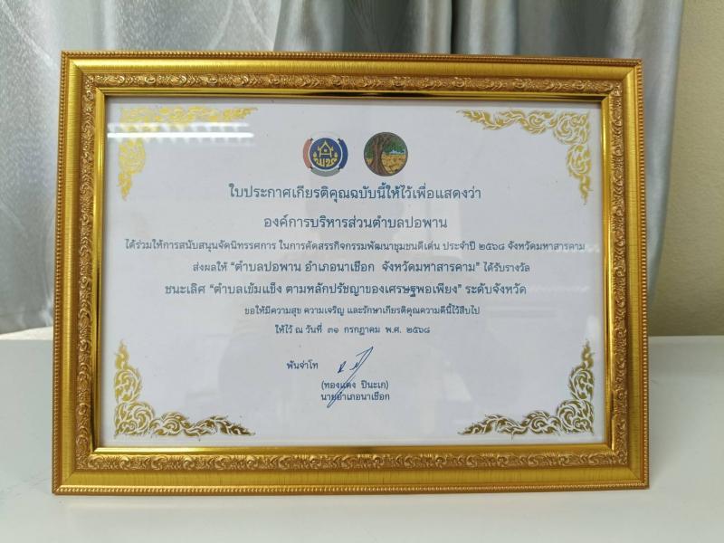 วันนี้ เวลา 09.30 น. องค์การบริหารส่วนตำบลปอพาน ตำบลปอพาน อำเภอนาเชือก จังหวัดมหาสารคาม ได้รับมอบใบประกาศเกียรติคุณ จากท่าน พันจ่าโททองแดง ปินะเก นายอำเภอนาเชือก ในการสนับสนุนจัดนิทรรศการ ในการคัดสรรกิจกรรมพัฒนาชุมชนดีเด่น ประจำปี 2568 จังหวัดมหาสารคาม ส่งผลให้ “ตำบลปอพาน อำเภอนาเชือก จังหวัดมหาสารคาม ได้รับรางวัลชนะเลิศ “ตำบลเข้มแข็ง ตามหลักปรัชญาของเศรษฐกิจพอเพียง” ระดับจังหวัด ณ ห้องประชุมอำเภอนาเชือก
