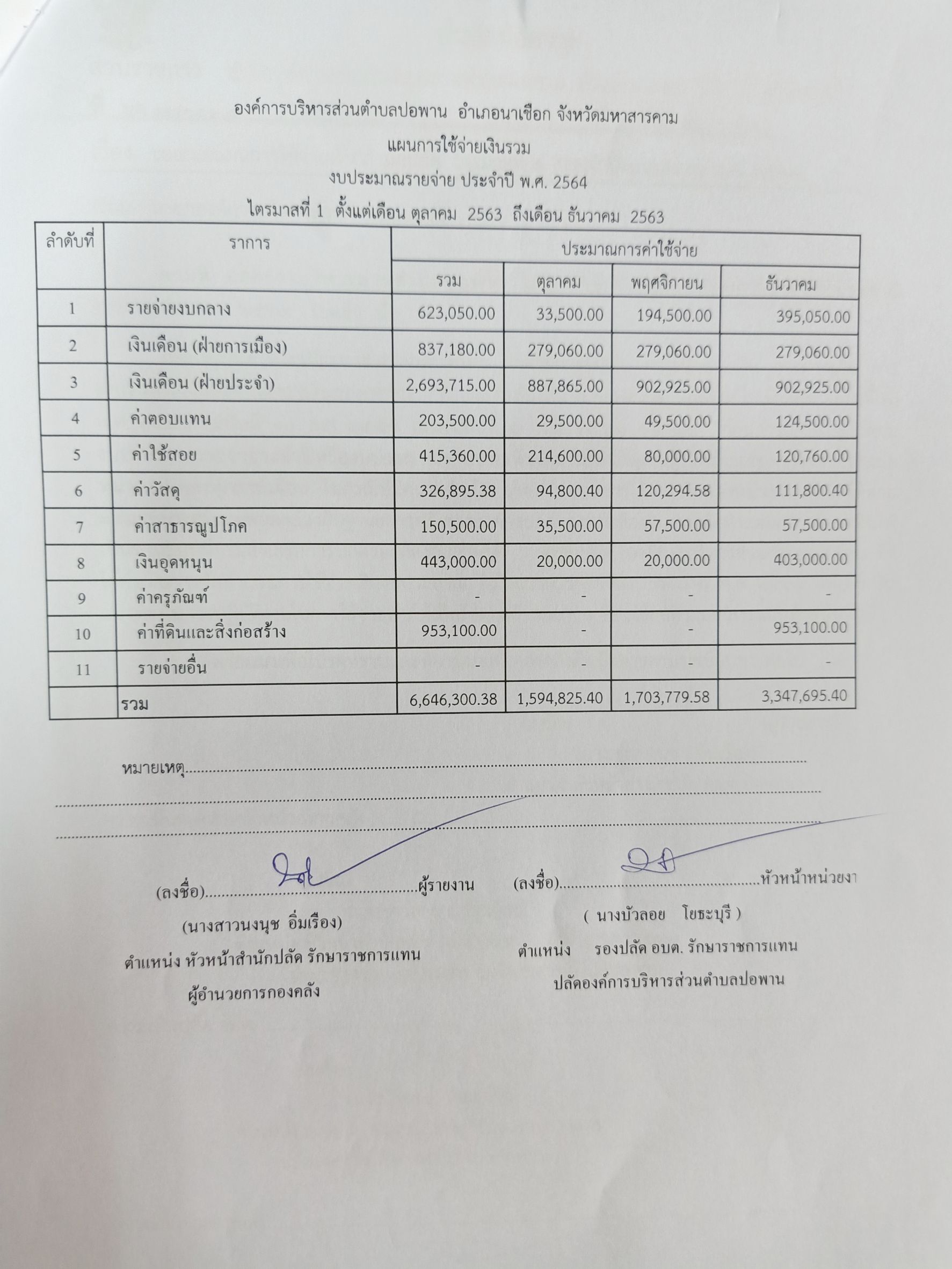 แผนการใช้จ่ายเงินรวมงบประมาณรายจ่ายประจำปี พ.ศ.2564 ไตรมาสที่ 1