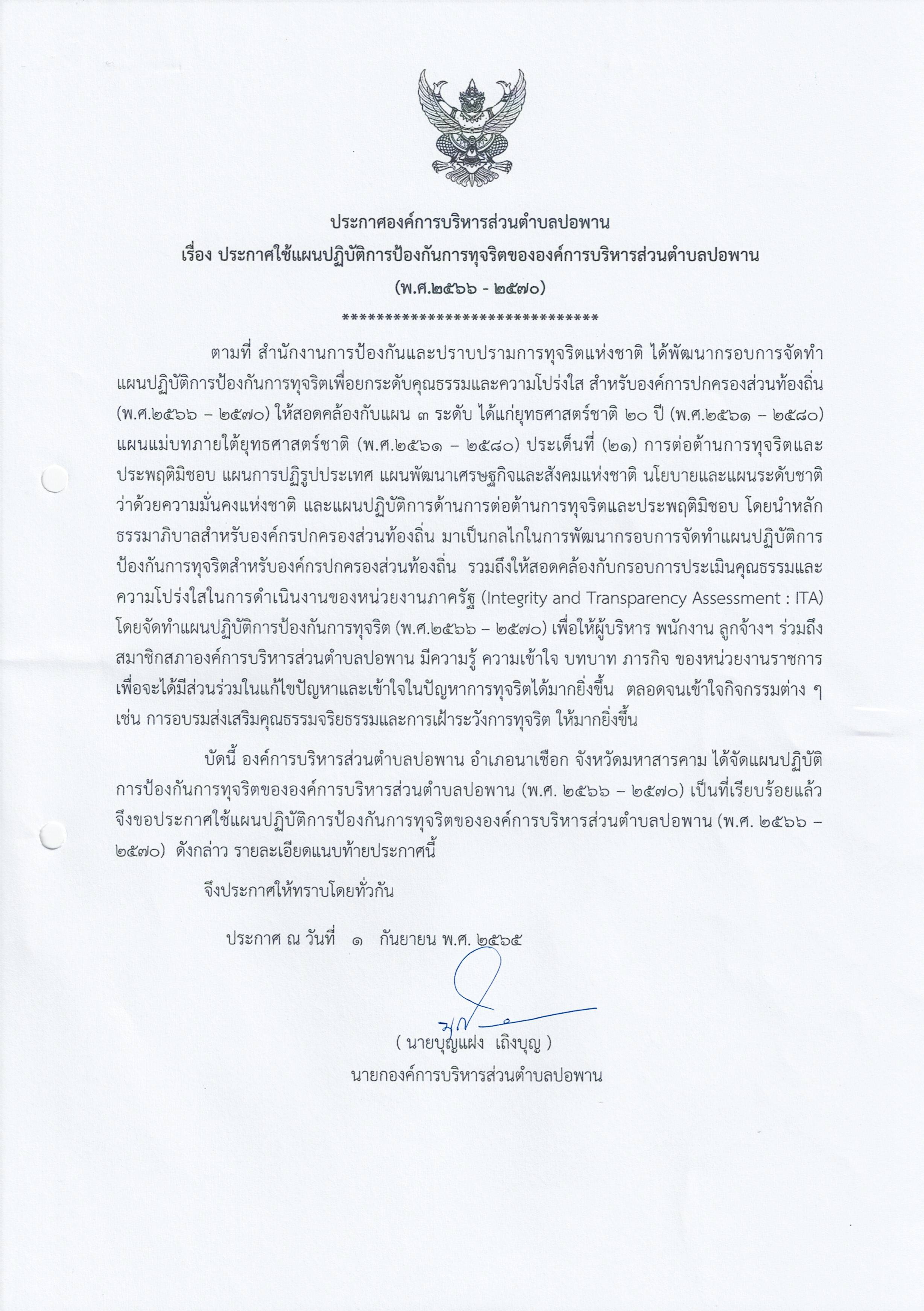 แผนปฏิบัติการป้องกันการทุจริต อบต.ปอพาน ประจำปี งบประมาณ พ.ศ.2566